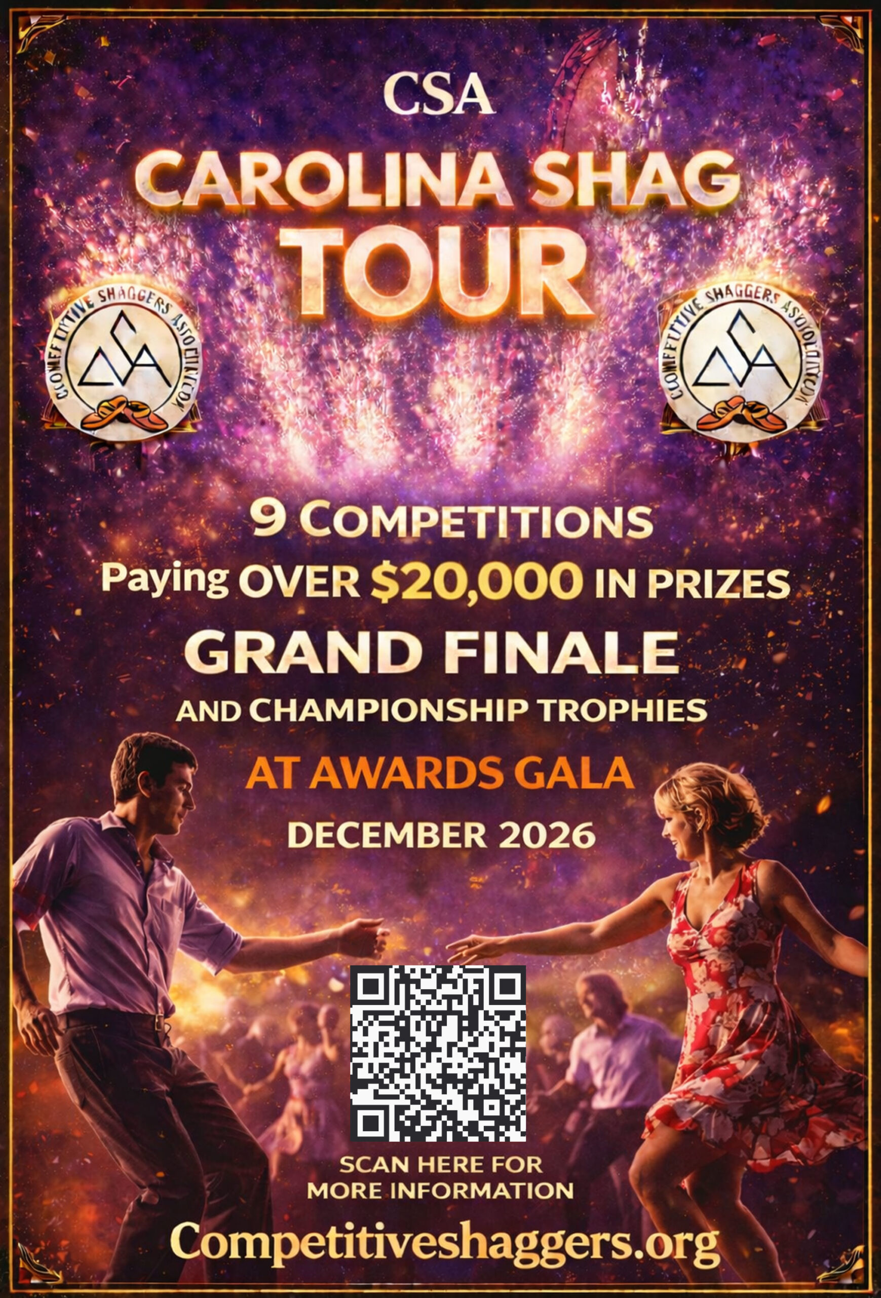 Welcome to the world of Competitive Shag Dance. Competitive Shag is a year of scheduled, sanctioned dance events that include divisions for Amateur, Novice (intermediate) and Pro(advanced) dancers. We also have a sanctioned Sr. Pro division for dancers from the Pro division who have reached the age of 55. Occasionally Junior dancer divisions are included in the competition. If you would like to join in on the fun of competition please click on the “Join CSA” link on the drop down menu under the “About CSA“ for instructions.